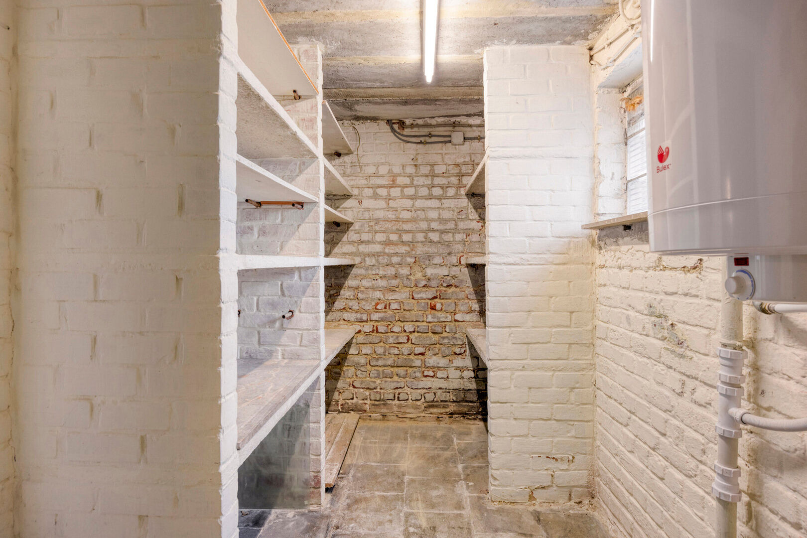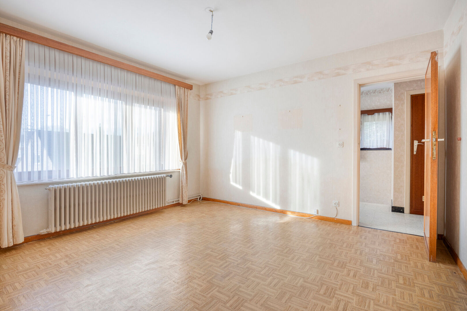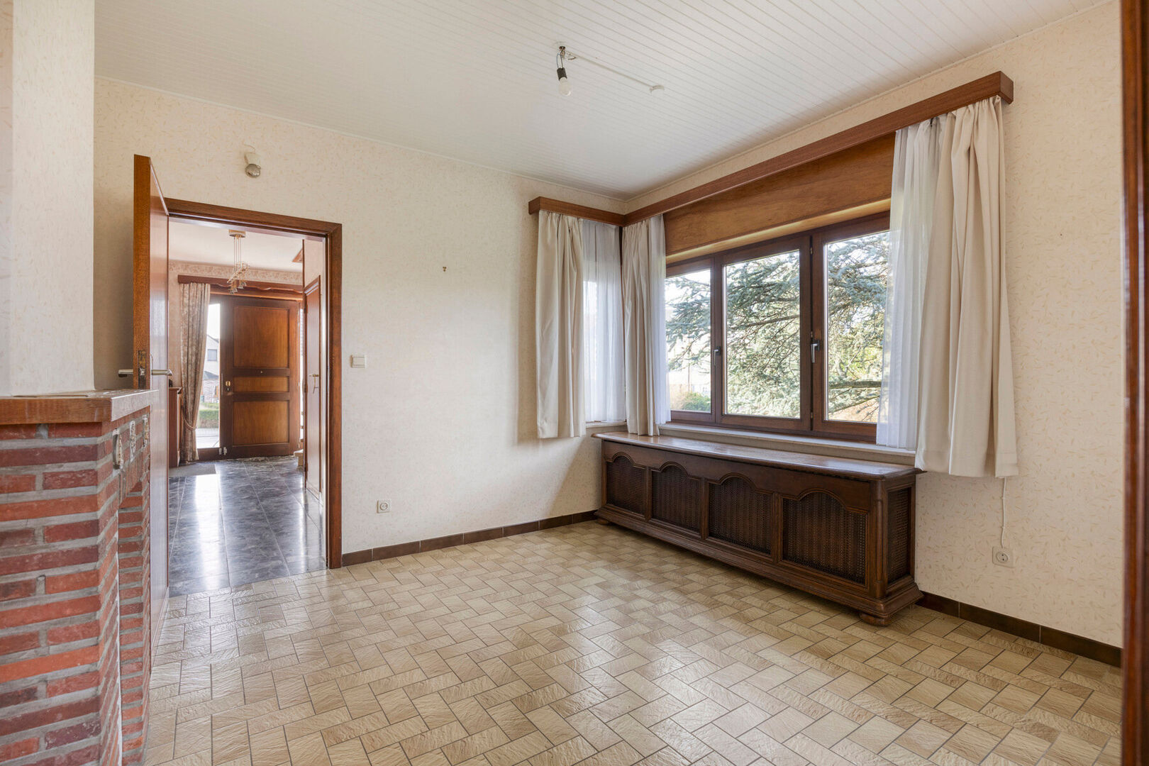 Bij het binnenkomen treft u een charmante inkomhal met apart gastentoilet, die leidt naar de lichte leefruimte en de keuken. De gezellige woonkamer geniet van overvloedig natuurlijk licht en biedt zicht op de veranda en de fraaie tuin.De keuken bevindt zich momenteel apart, maar kan – mits de nodige ingrepen – perfect worden omgevormd tot een open leefkeuken, waardoor één ruime en moderne leefruimte ontstaat.De woning beschikt over een volledige kelderverdieping met inpandige garage, ideaal voor stockage of hobbyruimte.